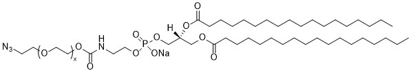 PEG derivatized lipids are used to increase the circulation time of liposomes and lipid nanoparticles (LNPs) in vivo. The hydrophilic PEG chains decrease interactions with the reticular-endothelial system and increases the size of the particles both of which result in lowered clearance rate from the body. Alkyne or DBCO containing molecules can be conjugated to the azido group through “click” chemistry.