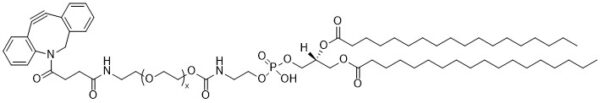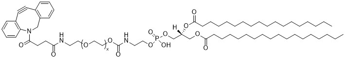 PEG derivatized lipids are used to increase the circulation time of liposomes and lipid nanoparticles (LNPs) in vivo. The hydrophilic PEG chains decrease interactions with the reticular-endothelial system and increases the size of the particles both of which result in lowered clearance rate from the body. The DBCO group of DSPE-PEG2000-DBCO can be reacted with azide-containing molecules in a catalyst-free “click” reaction. This reaction facilitates derivation of LNPs with a targeting molecule.